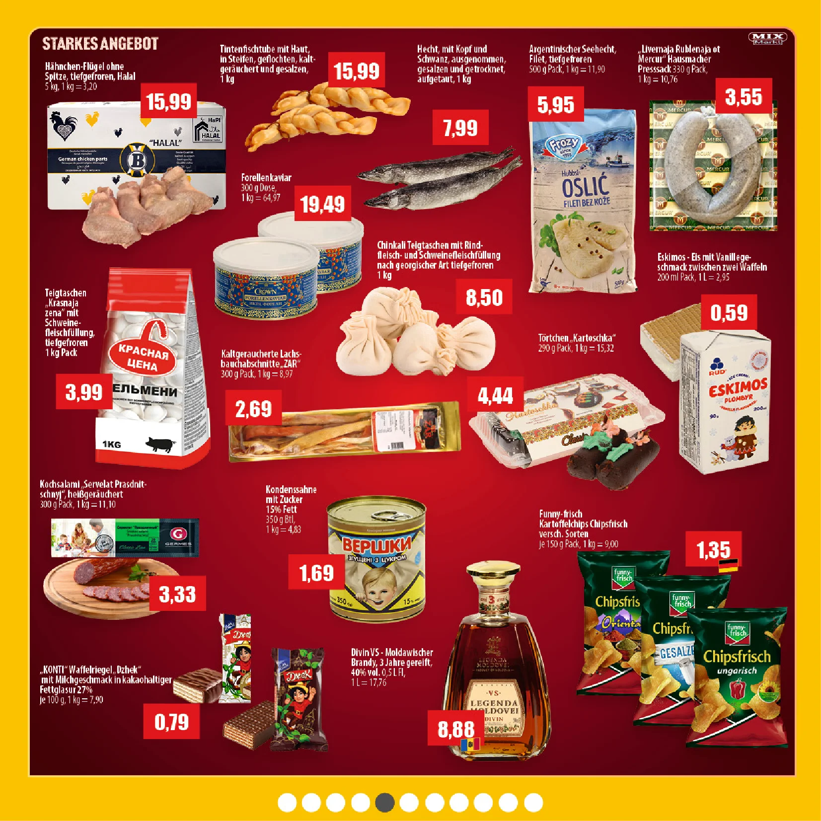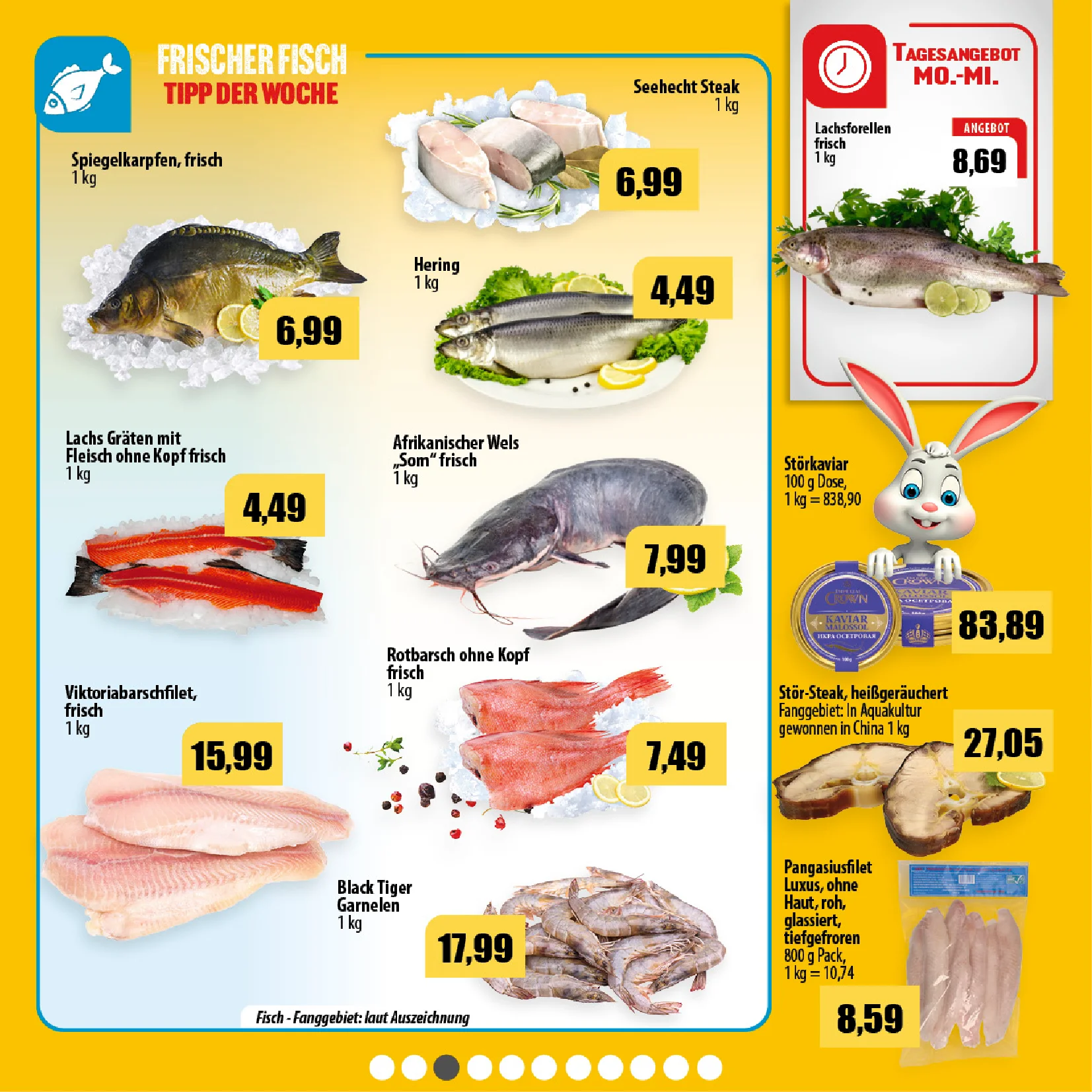 Auch preiswerte Alternativen wie Karpfen (6,29 €/kg) oder Seehecht ohne Kopf (6,49 €/kg) sind im Prospekt zu finden. Für besondere Anlässe gibt es sogar Forellenkaviar ? für 34,75 € pro 400 g Packung.