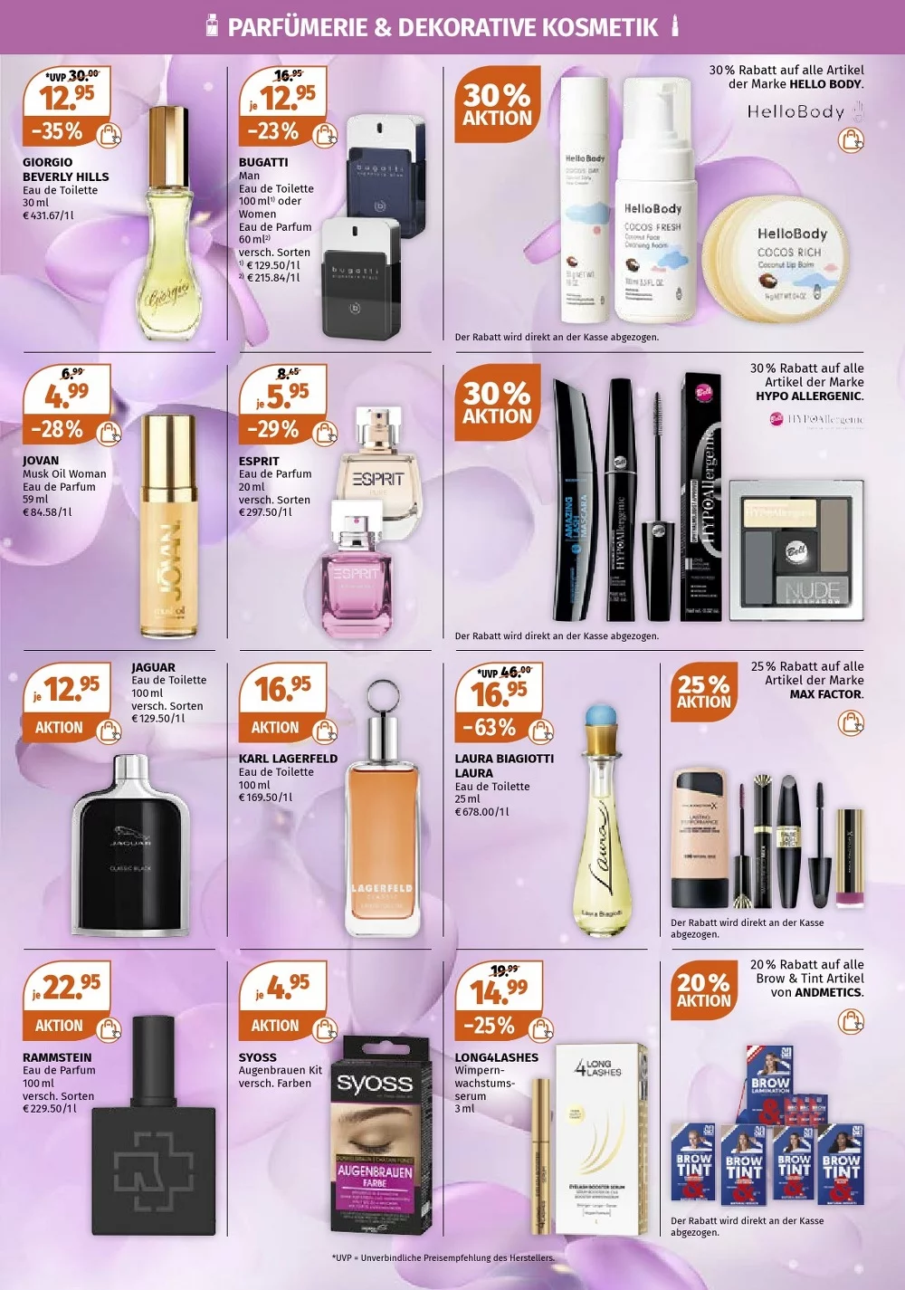 Im Fokus stehen exklusive Pflege-Highlights von Lancôme, Biotherm und Kiehl’s ?. Kundinnen und Kunden profitieren von Preisnachlässen von bis zu -41 % auf ausgewählte Cremes, Bodylotions und Eau de Toilette Varianten. Besonders beliebt sind nährende Gesichtscremes, feuchtigkeitsspendende Body Milk sowie Augenpflege mit Avocado ?.
