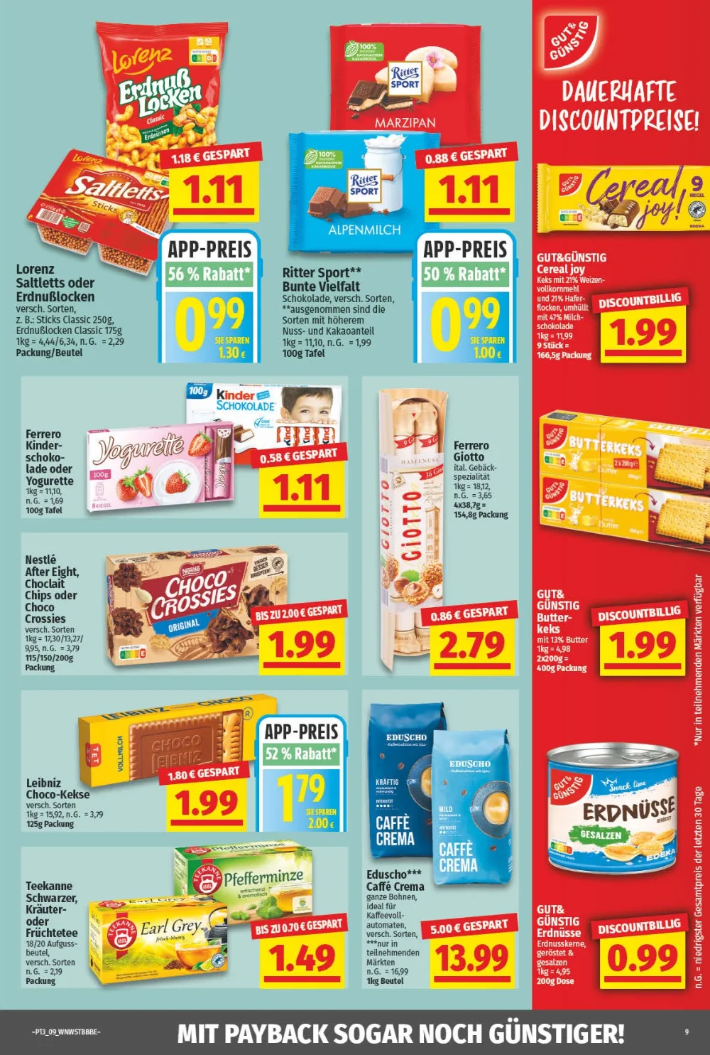 Der untere Bereich zeigt beliebte Süßwaren ?. Dazu gehören Ferrero Rocher (200 g) für 2,99 €, Haribo Goldbären Minis für 1,79 € und ein niedlicher Kinder Schoko-Osterhase ? für 1,11 €.