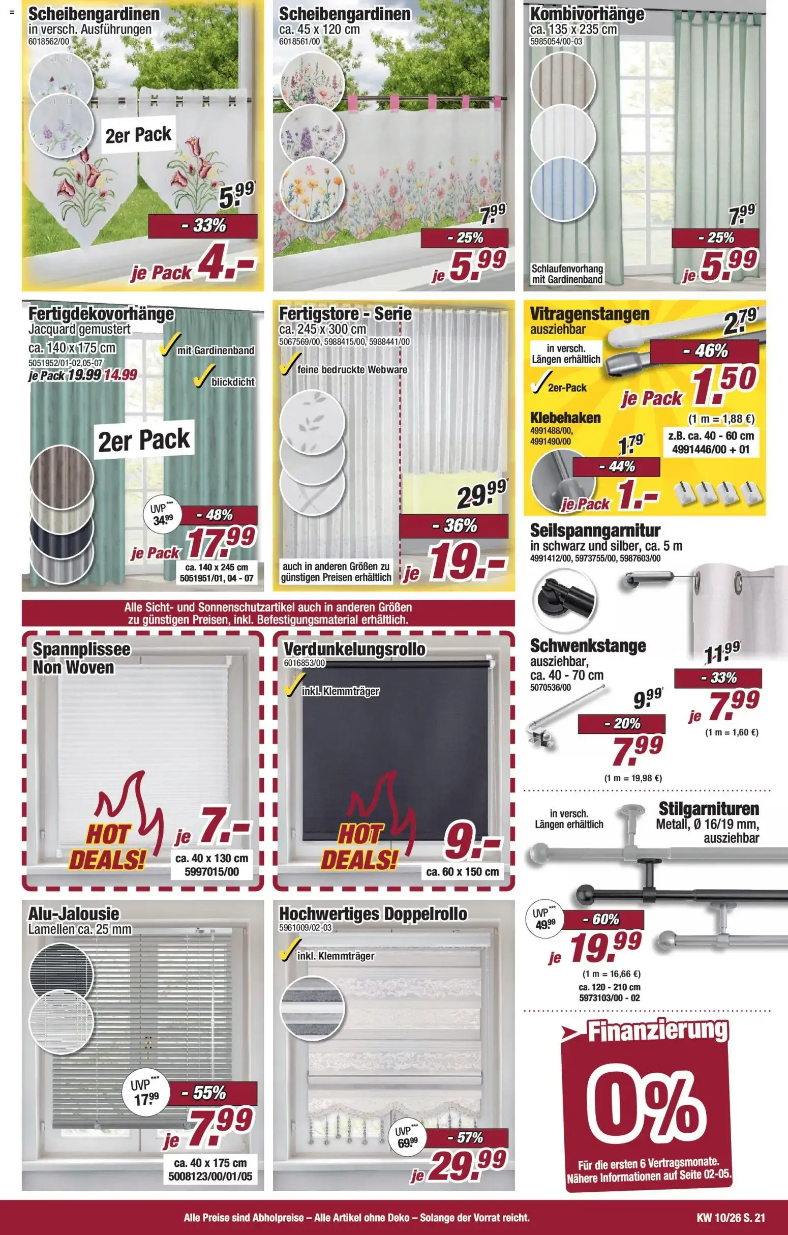 Das Foto zeigt eine dicht strukturierte Prospektseite mit zahlreichen Wohn- und Küchenangeboten. Abgebildet sind verschiedene Teppicharten, Vinyl- und Laminatböden in Holz- und Steinoptik sowie Gardinen und Wohnaccessoires. Große rote Preisangaben, Prozent-Rabatte und Hinweise wie „Finanzierung 0%“ oder „Hot Deals“ stechen sofort ins Auge ?. Die Gestaltung ist übersichtlich in einzelne Angebotsfelder gegliedert.