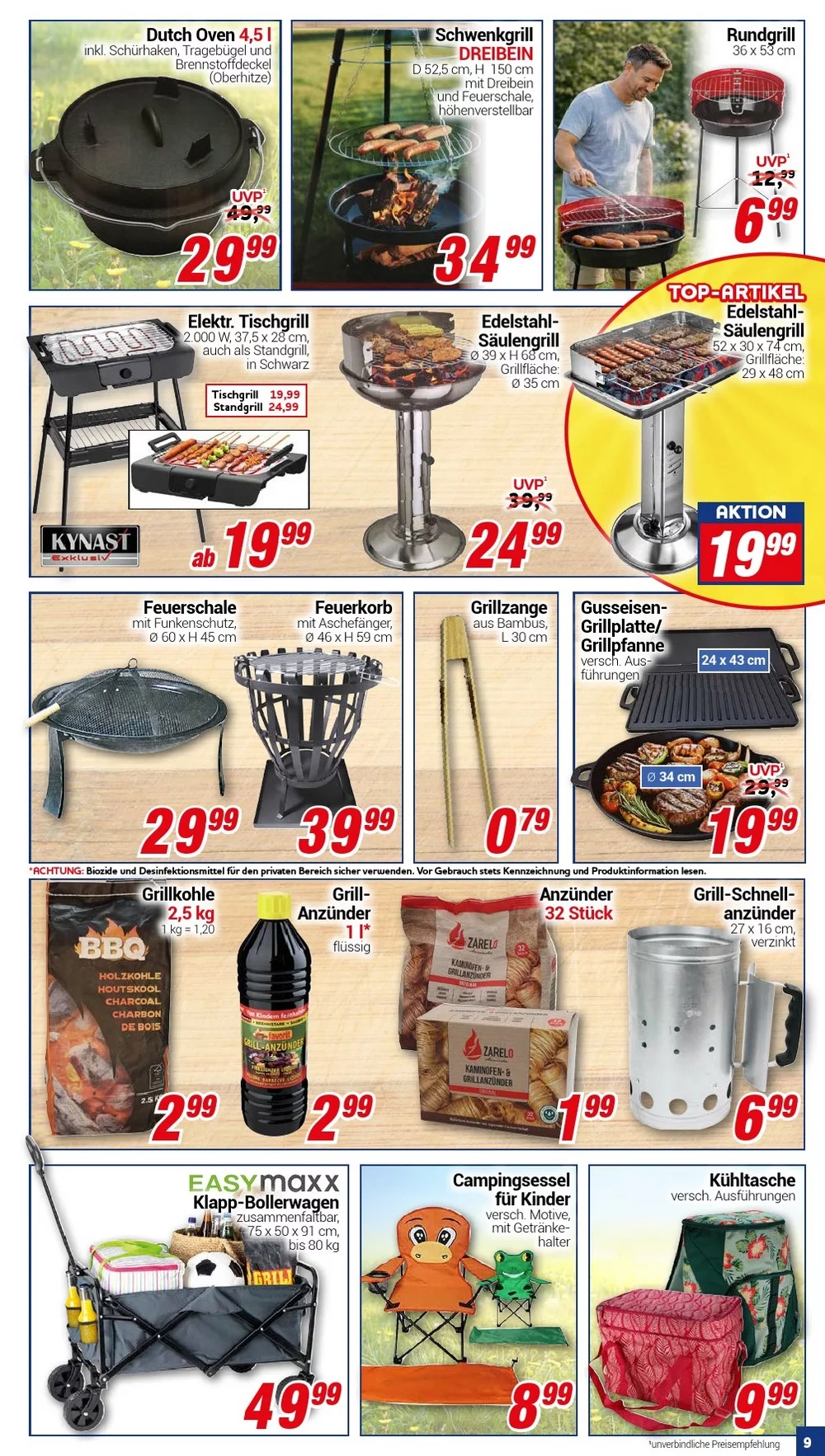 Außerdem zeigt der Prospekt einen Rundgrill für nur 6,99 €, sowie einen BBQ-Grillwagen Deluxe mit Ablagefläche ebenfalls für 29,99 € ?. Für Fans von robusten Grillgeräten gibt es einen Säulengrill aus Edelstahl für 24,99 € und einen Standgrill mit 2000 Watt Leistung zum gleichen Preis.