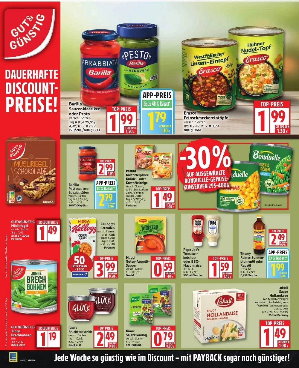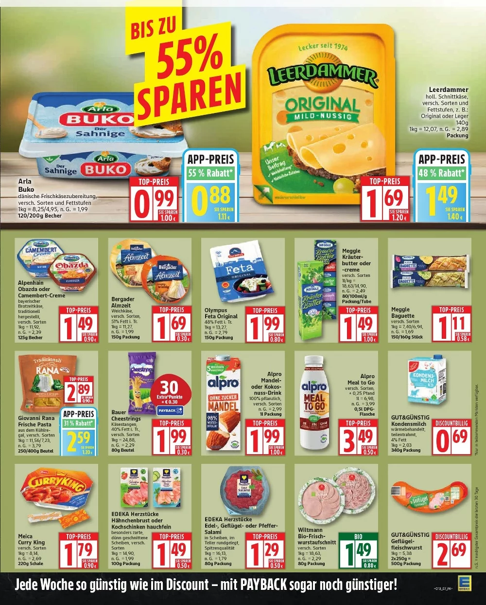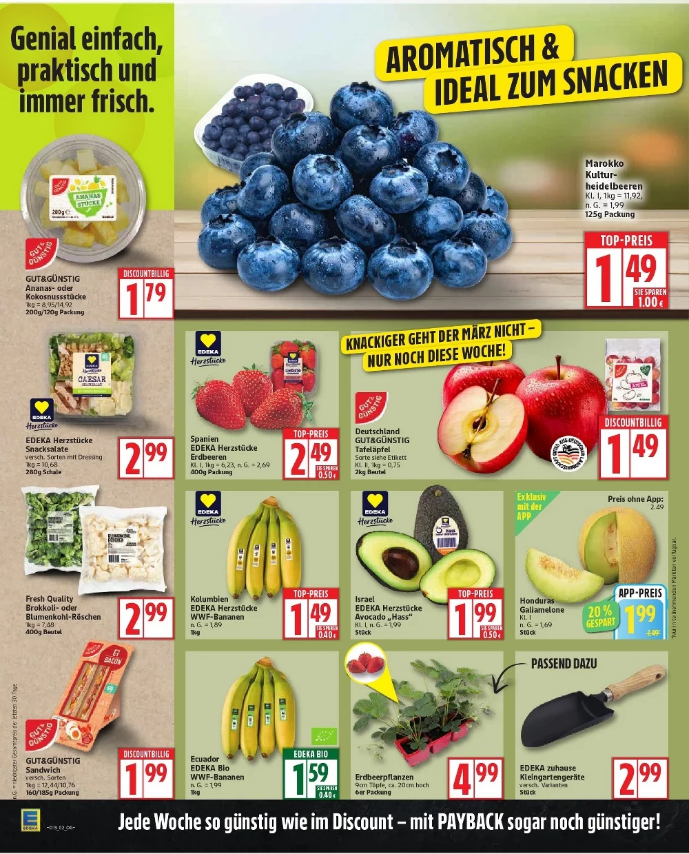 ? Auf der ersten Seite eines typischen Edeka Prospekts stehen meist die großen Wochenangebote im Mittelpunkt. Zu sehen sind häufig frische Produkte wie saftige Äpfel ?, Bananen ? oder Beeren, daneben hochwertiges Fleisch wie Rindersteaks oder Geflügel ?. Außerdem werden bekannte Markenprodukte wie Pasta, Schokolade oder Getränke präsentiert, die mit großen Preislabels und Rabattangaben hervorgehoben sind. Die Gestaltung ist übersichtlich und farbenfroh, sodass Kundinnen und Kunden die besten Schnäppchen sofort erkennen können.