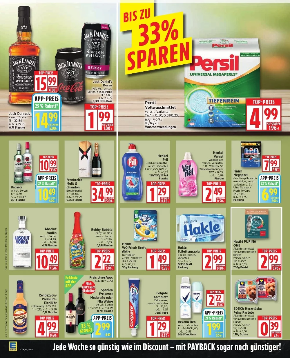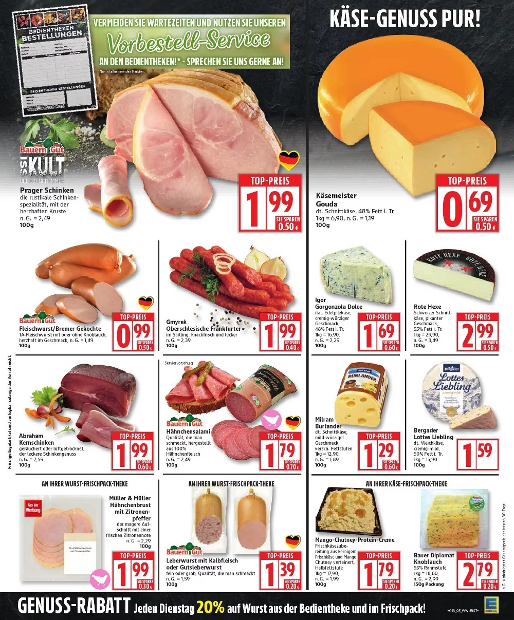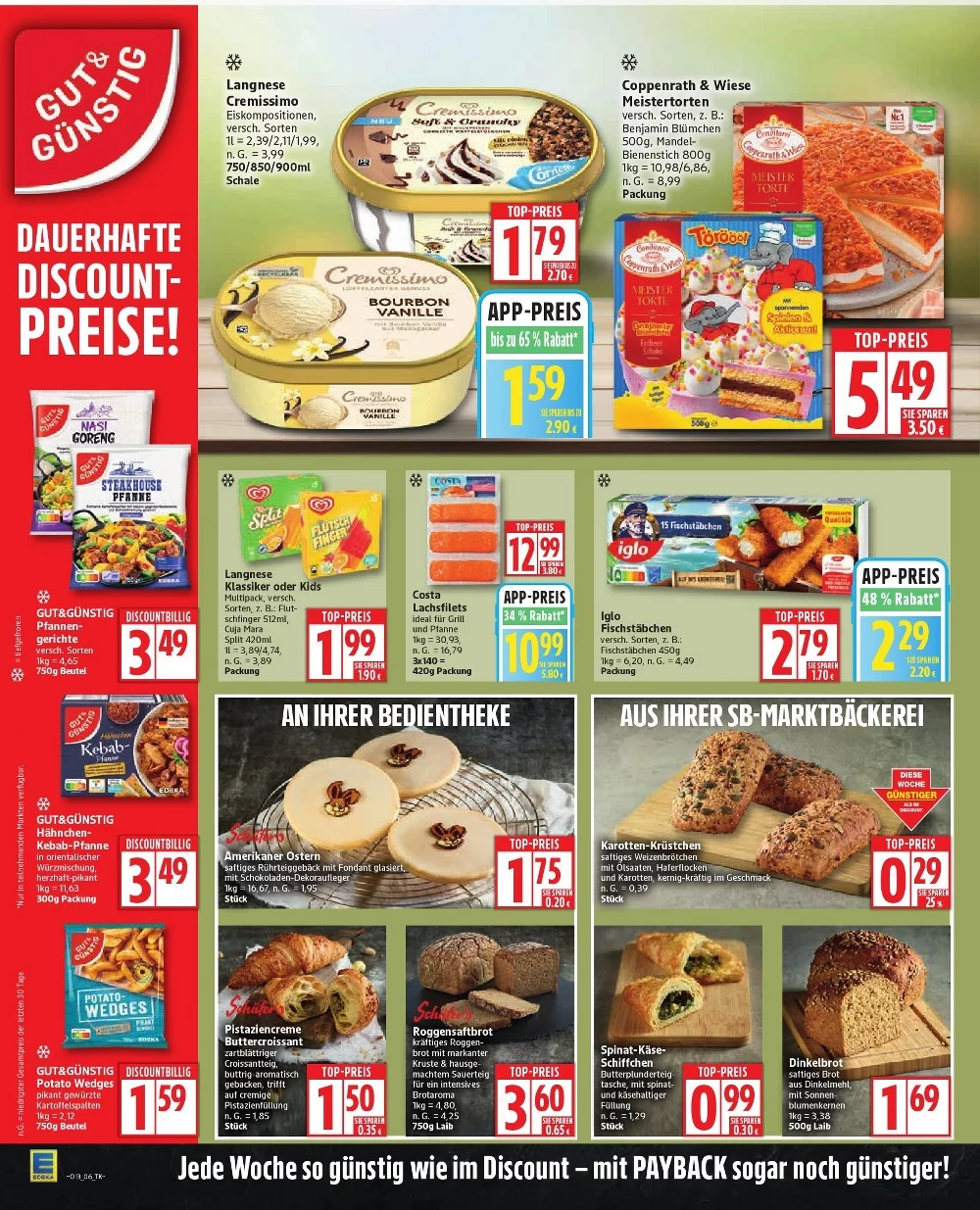 ? Auf der ersten Seite eines typischen Edeka Prospekts stehen meist die großen Wochenangebote im Mittelpunkt. Zu sehen sind häufig frische Produkte wie saftige Äpfel ?, Bananen ? oder Beeren, daneben hochwertiges Fleisch wie Rindersteaks oder Geflügel ?. Außerdem werden bekannte Markenprodukte wie Pasta, Schokolade oder Getränke präsentiert, die mit großen Preislabels und Rabattangaben hervorgehoben sind. Die Gestaltung ist übersichtlich und farbenfroh, sodass Kundinnen und Kunden die besten Schnäppchen sofort erkennen können.