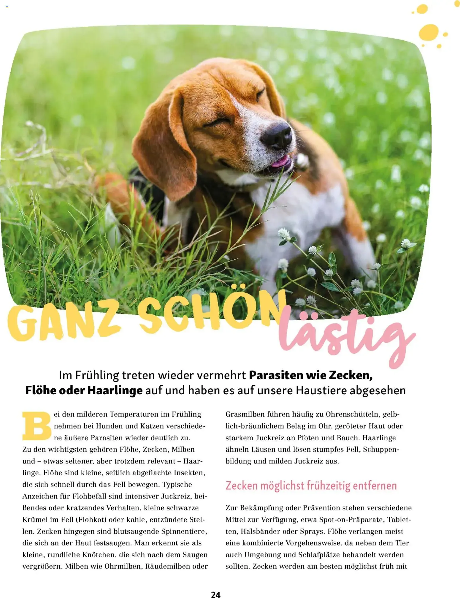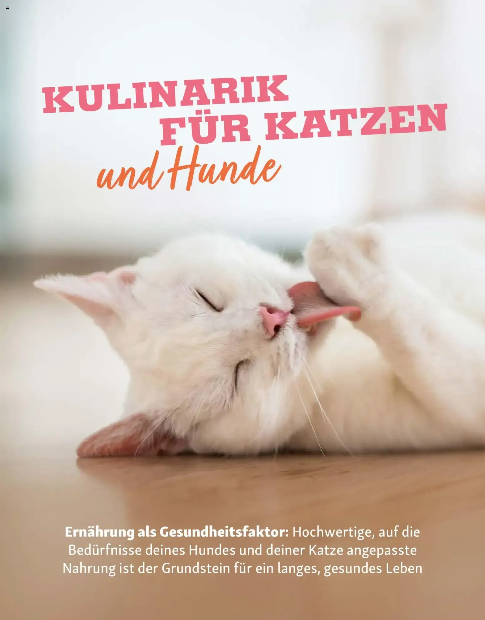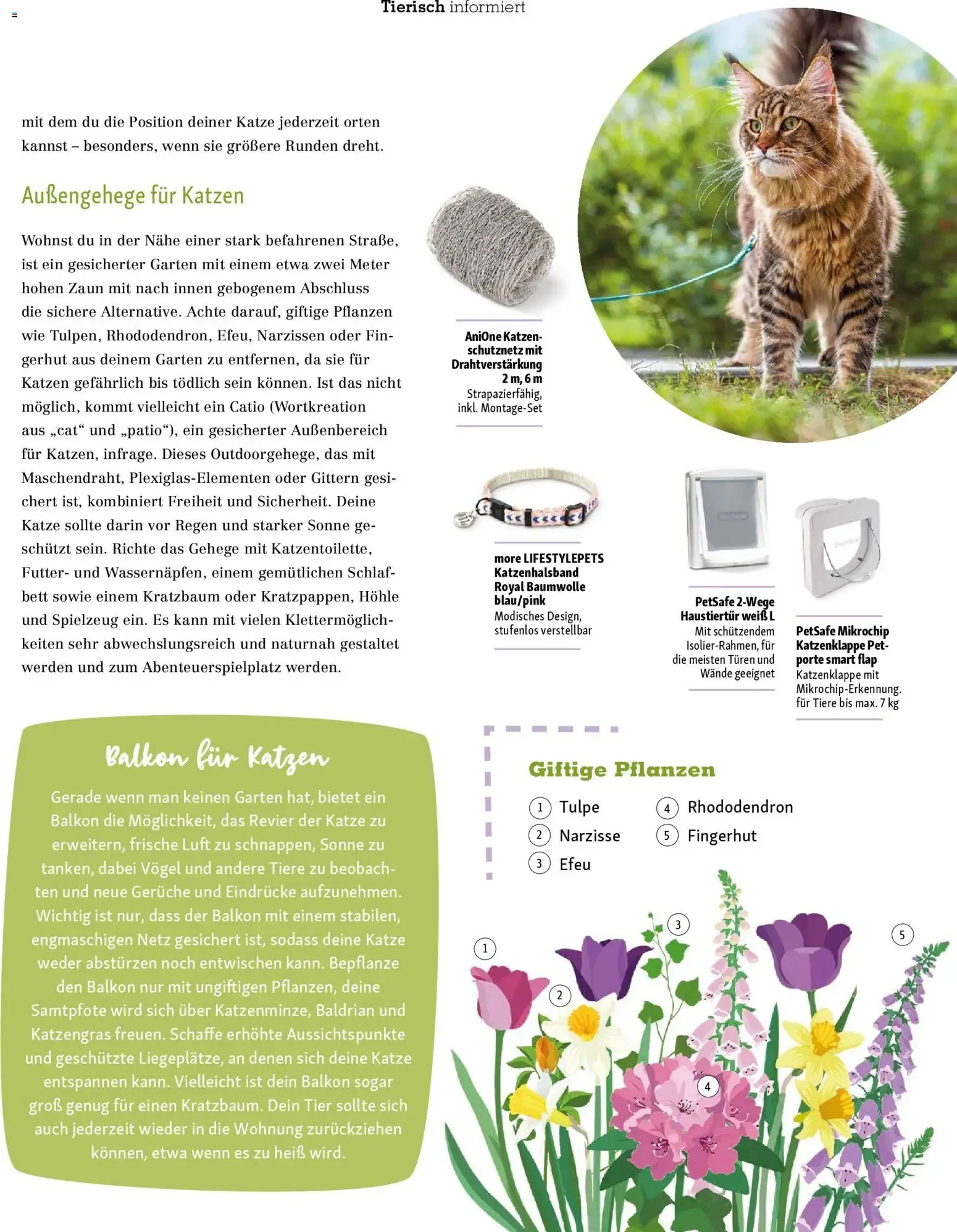 Auf dieser wunderschön gestalteten Magazinseite des aktuellen Katalogs dreht sich alles um das spannende Thema „Mit Sicherheit im Grünen“. 🌳 Das stimmungsvolle Foto zeigt eine bezaubernde, strahlend weiße Katze mit faszinierenden grünen Augen, die völlig entspannt auf einer rustikalen Steinmauer vor einem Meer aus leuchtend orangefarbenen Blumen ruht. 🐈🌼 Der dazugehörige informative Artikel richtet sich an alle Besitzer von Freigängern, Balkontigern oder Gartenkatzen und bietet wertvolle Tipps, damit die Tiere den Spaß an der frischen Luft sicher genießen können. ☀️