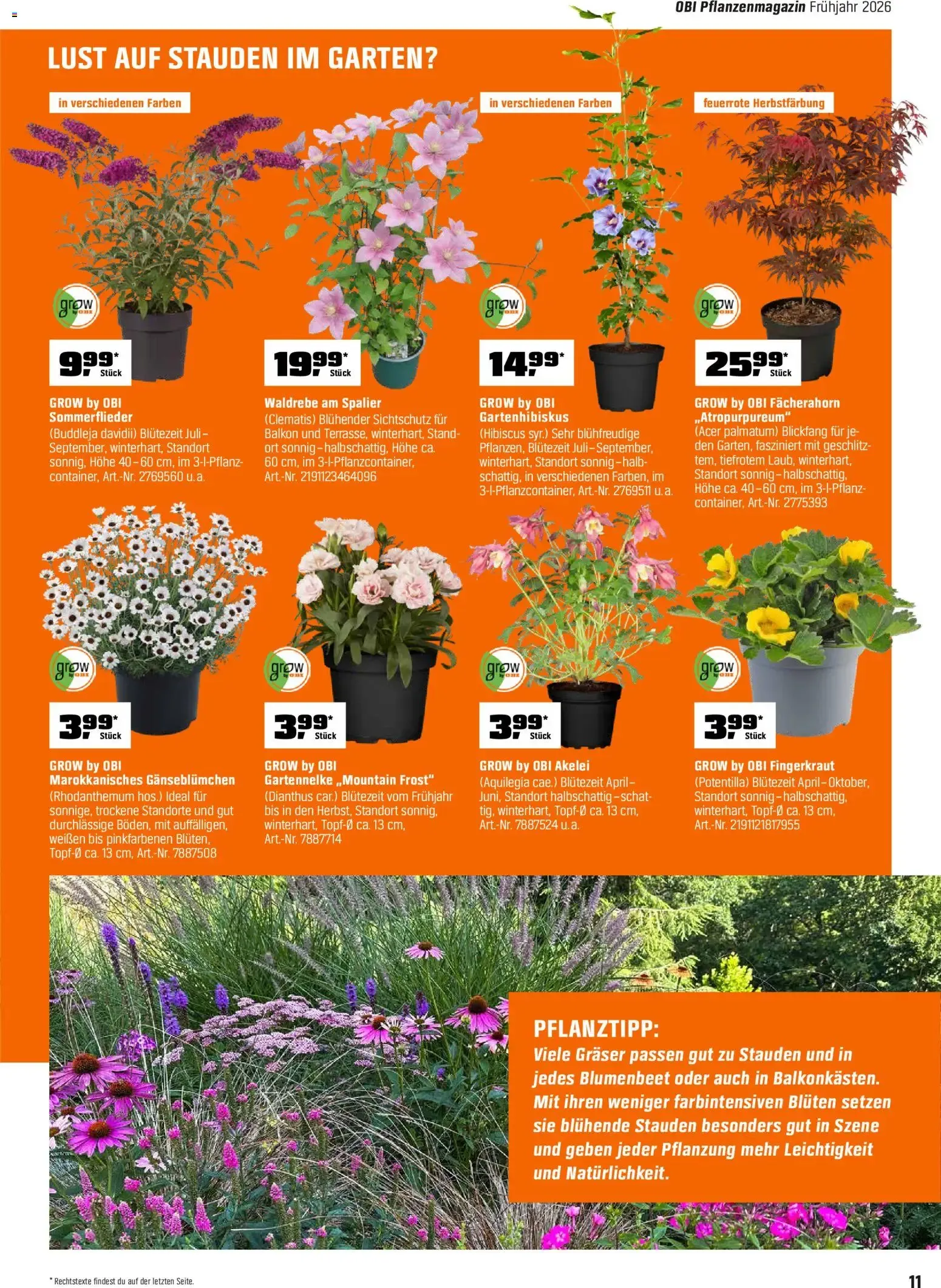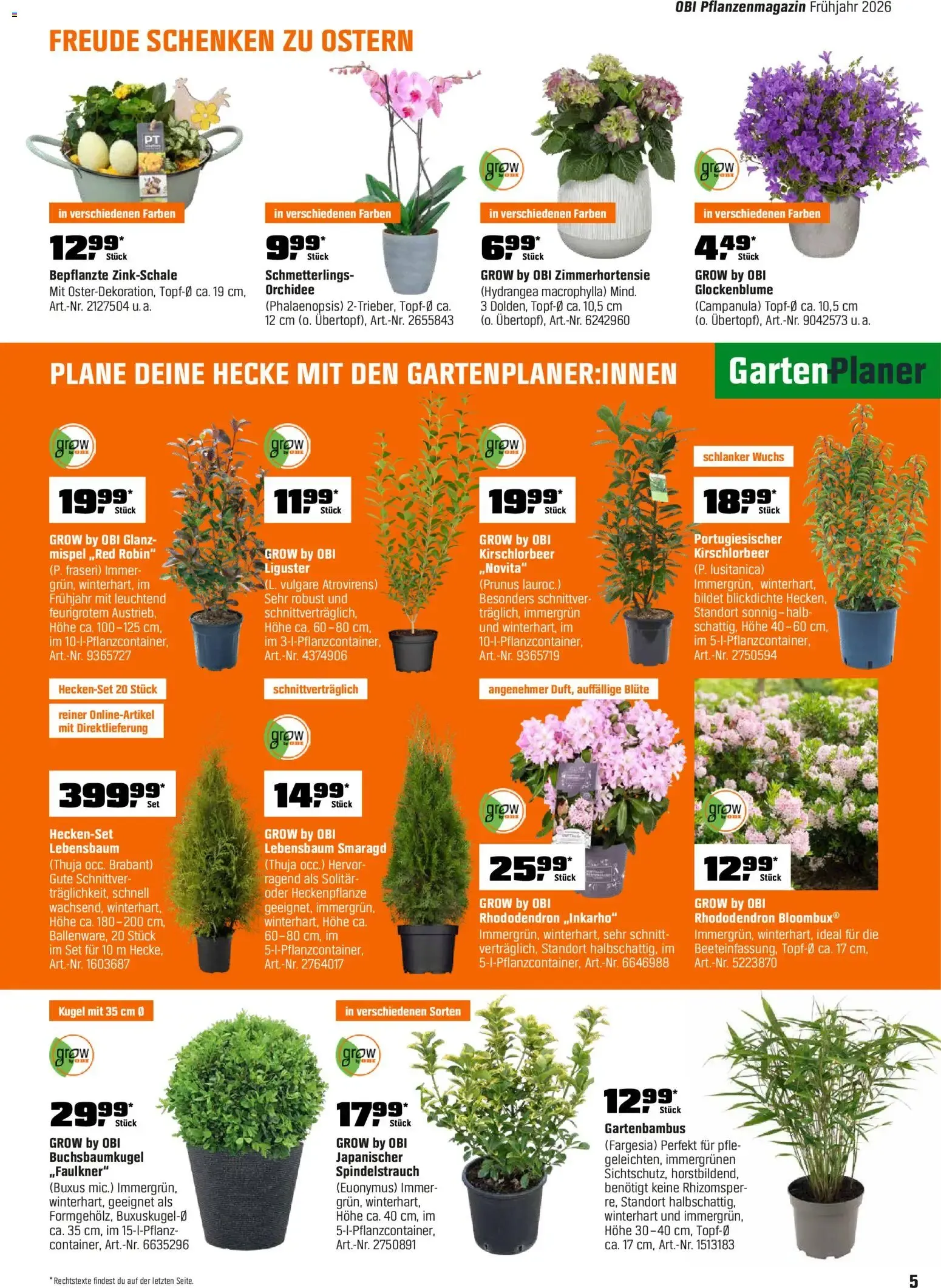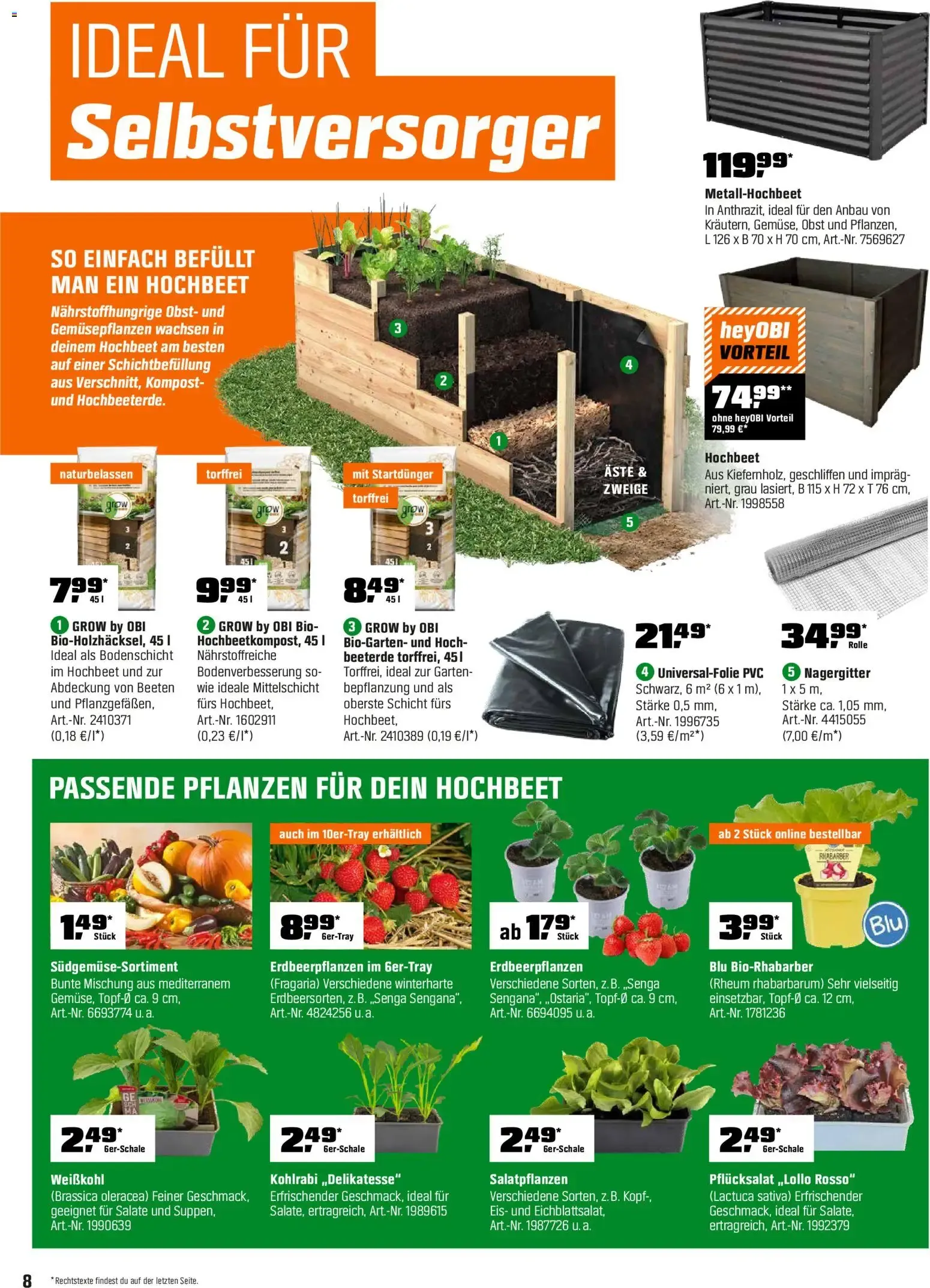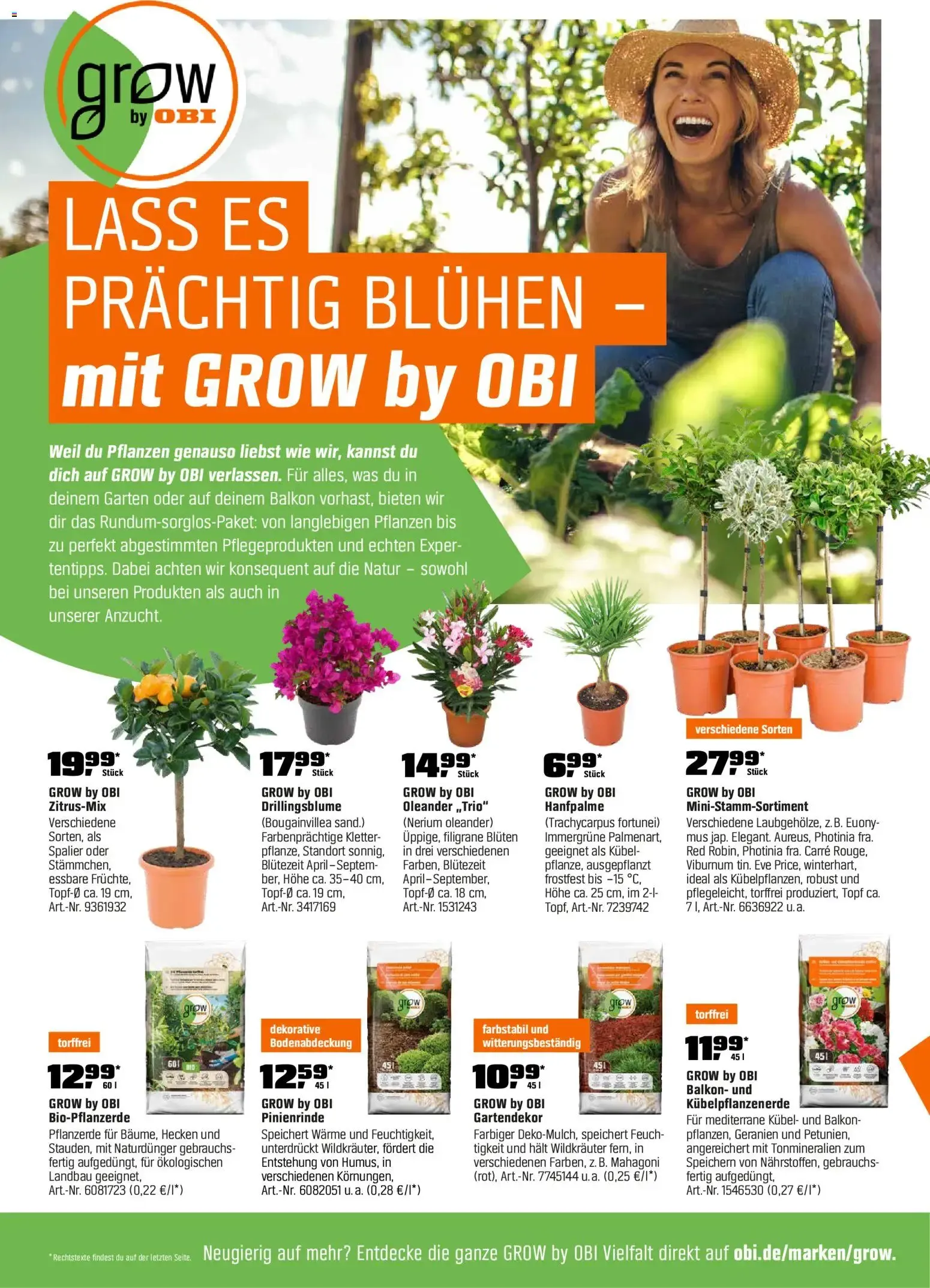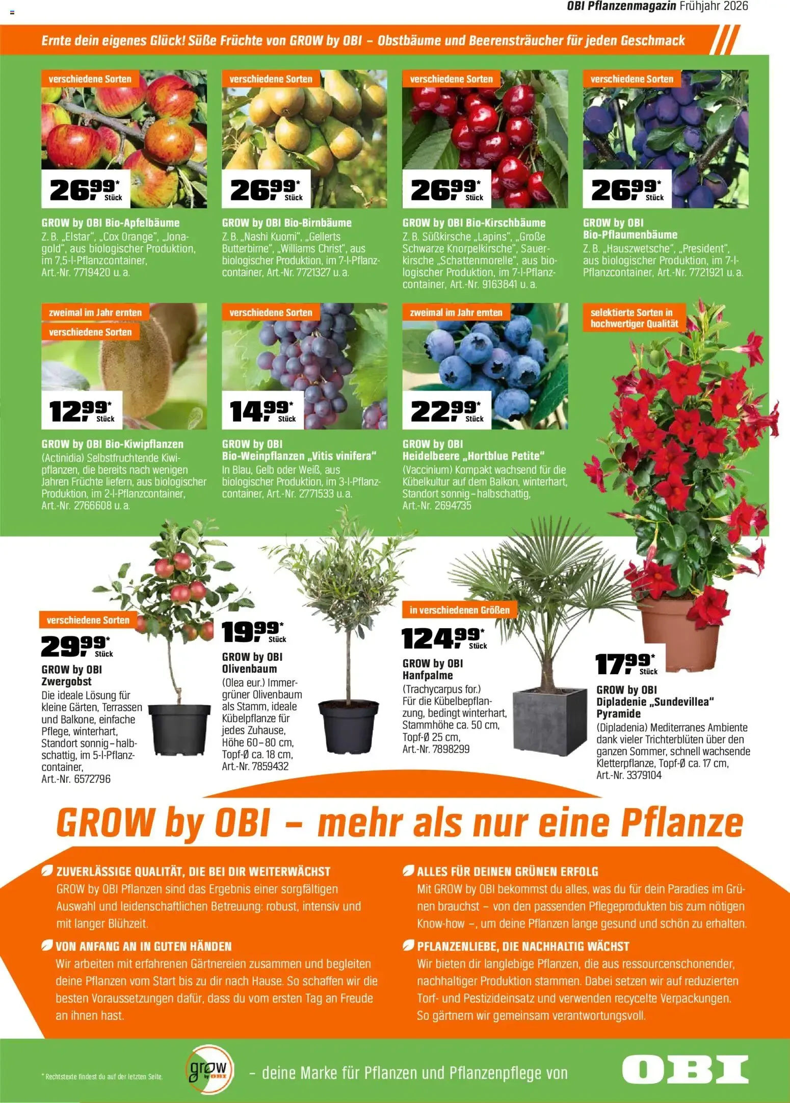 Im unteren Bereich der informativen Katalogseite wird das umweltfreundliche Konzept von GROW by OBI noch einmal deutlich hervorgehoben. Das Unternehmen setzt auf eine ressourcenschonende, nachhaltige Produktion mit recycelten Verpackungen, deutlich reduziertem Torf- und Pestizideinsatz sowie zuverlässiger Gärtnerqualität von Anfang an. 🌱 Planen Sie jetzt Ihre neue grüne Oase und holen Sie sich blühende Freude und leckere Früchte direkt nach Hause! 🛒✨