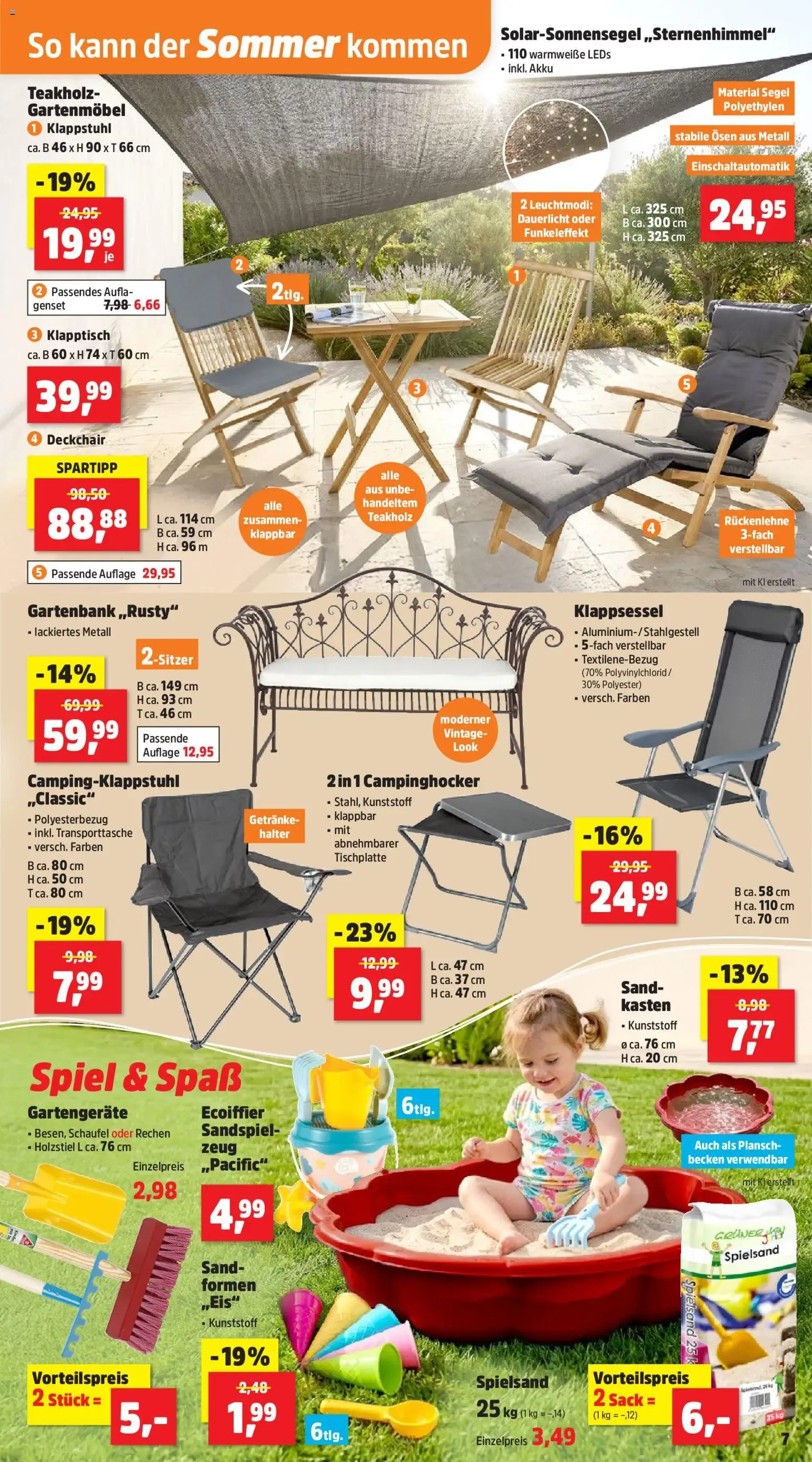 Ein Highlight ist der Alu-Sonnenschirm mit stabilem Gestell und großem Durchmesser, ideal für sonnige Tage ☀️. Dazu passt der robuste Schirmständer, der für sicheren Halt sorgt. Ebenfalls abgebildet sind verschiedene Klappstühle, Relaxsessel und Sonnenliegen – praktisch, platzsparend und bequem 🌿.
