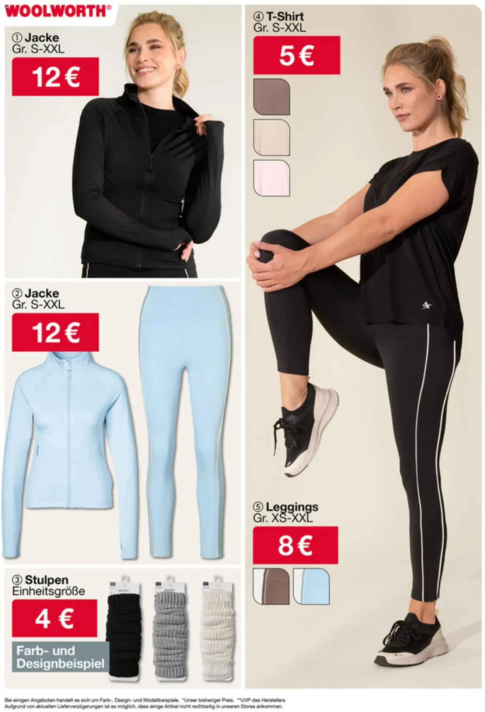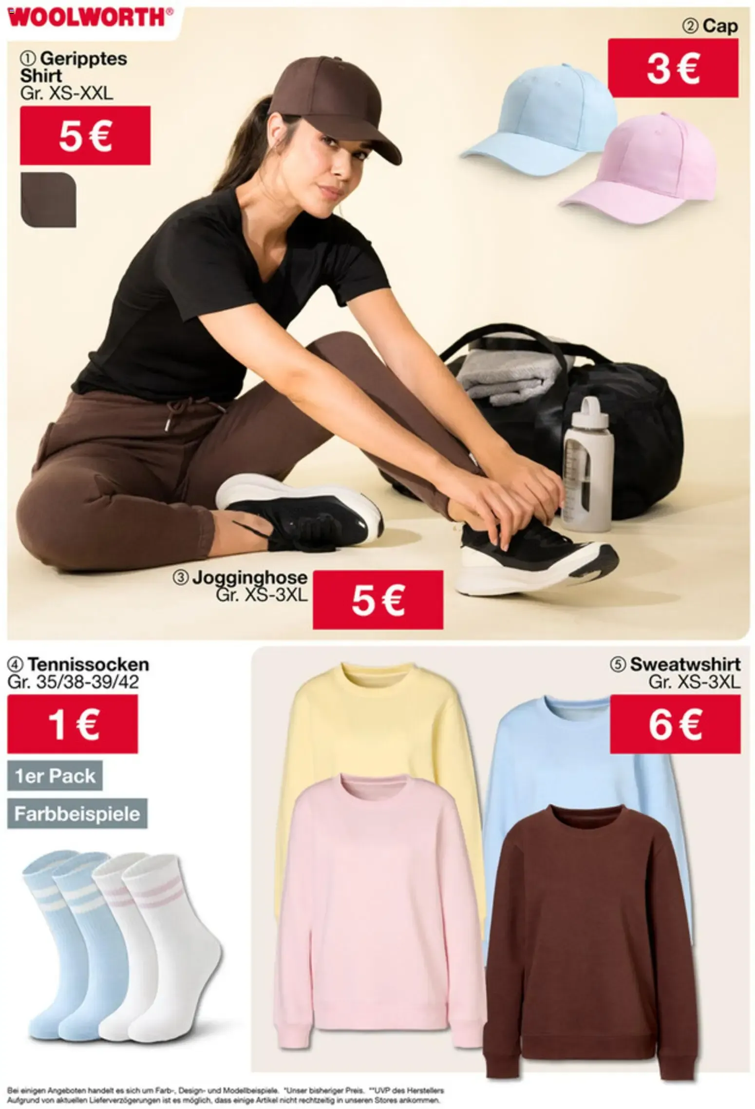 Auf dem Bild aus dem aktuellen Woolworth Prospekt Angebote sieht man eine Mode-Aktion mit verschiedenen Kleidungsstücken für Damen ?. Links trägt ein Model ein bequemes schwarzes Freizeit-Set bestehend aus Sweatshirt für nur 6 € und Jogginghose für 5 €, kombiniert mit weißen Sneakers ?. Das Outfit wirkt sportlich, modern und perfekt für entspannte Tage oder Freizeitaktivitäten.